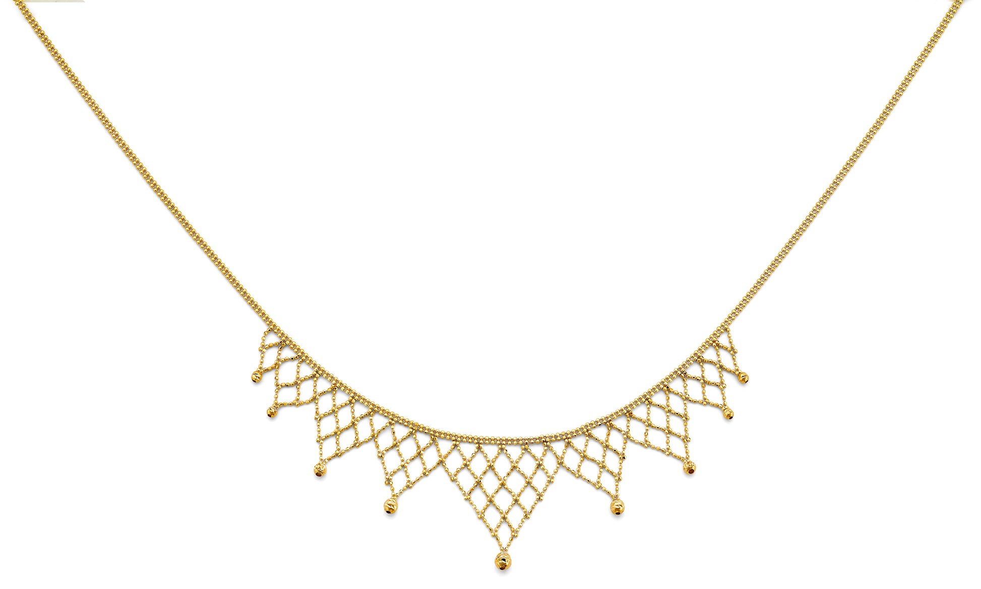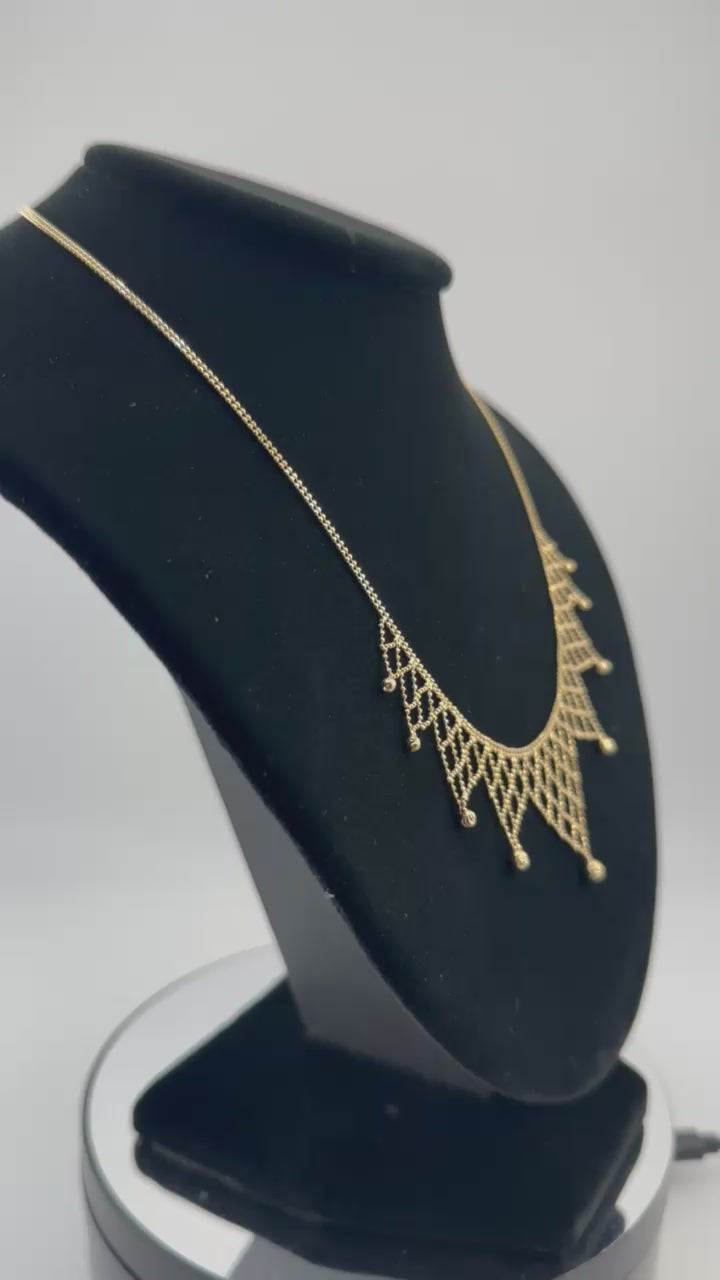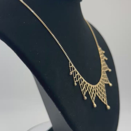 Elevate your style with this 14K Gold Beaded Necklace, a bold yet elegant statement piece designed to turn heads. Crafted in solid 14K yellow gold, this necklace features a striking beaded lattice design accented with delicate dangle beads, giving it both sophistication and movement.