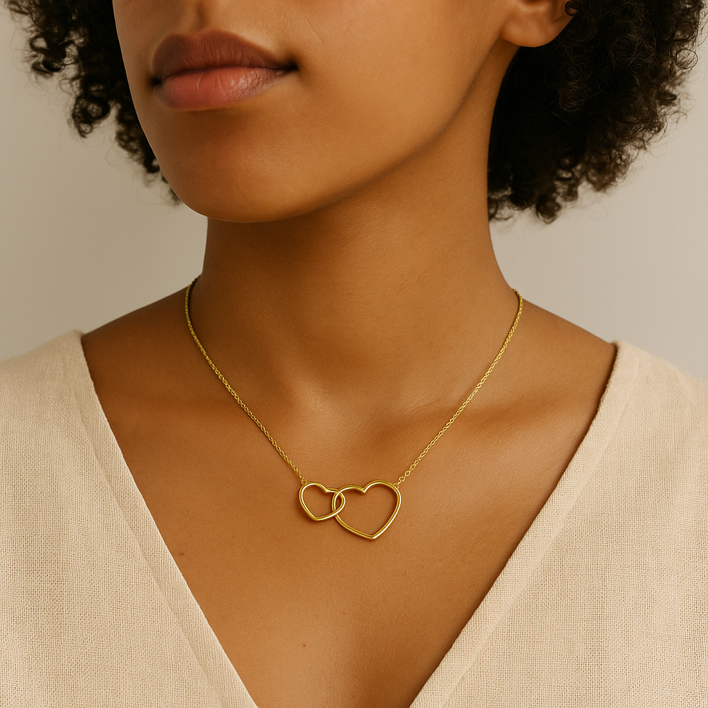 This 14K Gold Together Heart Necklace features two interlocking open hearts that represent unity, love, and forever bonds. Expertly crafted in real 14K yellow gold, the pendant is suspended from a delicate yet durable gold chain for a sophisticated and meaningful look.