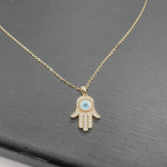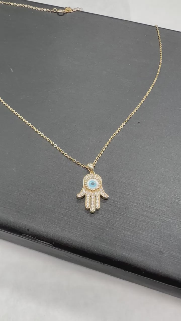 Bring meaning and sparkle to your jewelry collection with this 14K Gold Evil Eye CZ Hamsa Necklace, expertly crafted to combine modern elegance with ancient symbolism. The polished real 14K yellow gold pendant showcases the traditional Hamsa hand, accented with brilliant cubic zirconia stones and a striking blue evil-eye centerpiece for a dazzling, protective touch.