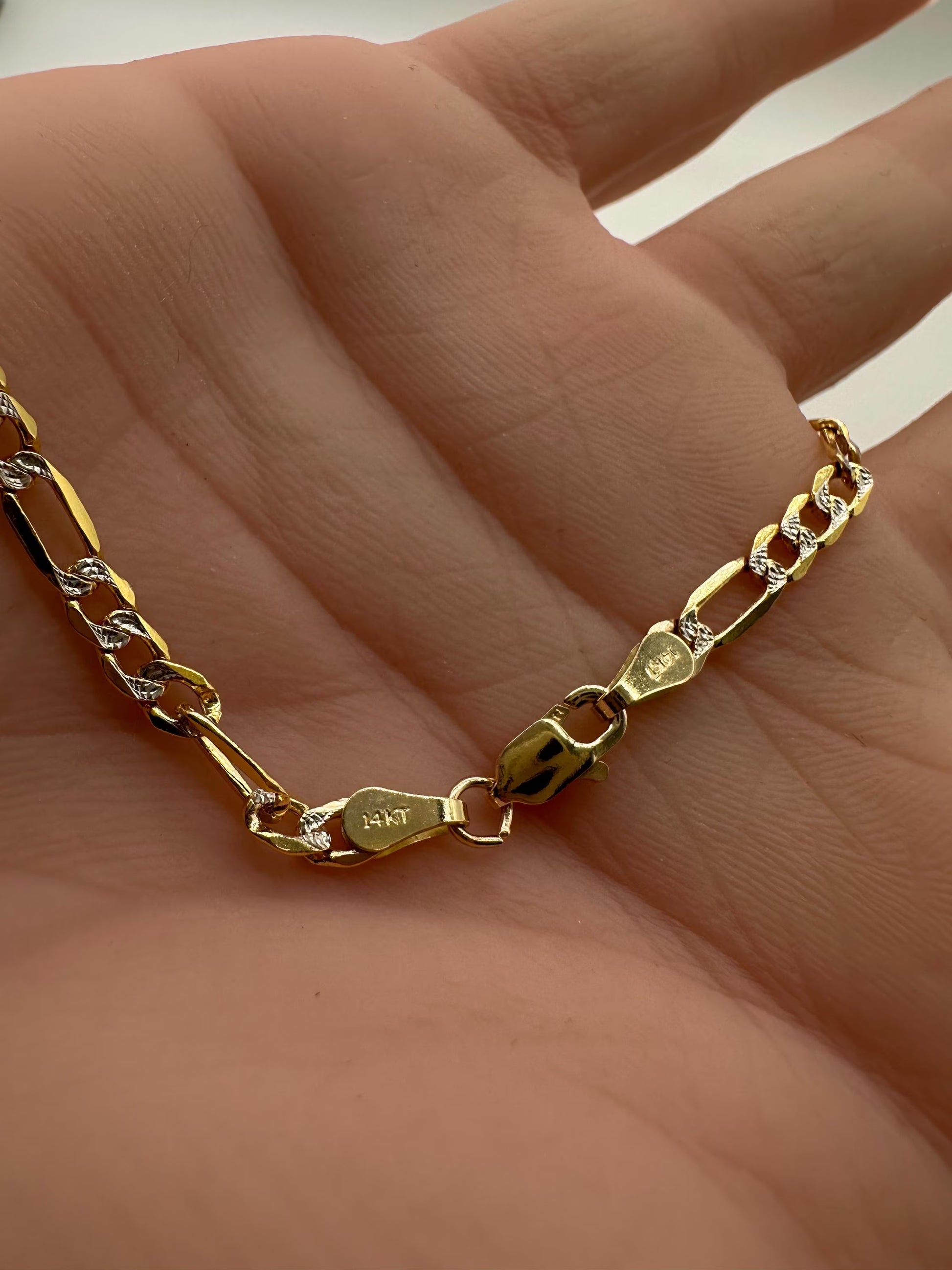 Elevate your style with this stunning 14K Gold Figaro Chain, crafted in a classic 3+1 link pattern with a polished white and yellow gold finish. Lightweight yet durable, this hollow Figaro chain is designed to be versatile, making it perfect as a statement piece or paired with your favorite pendant.