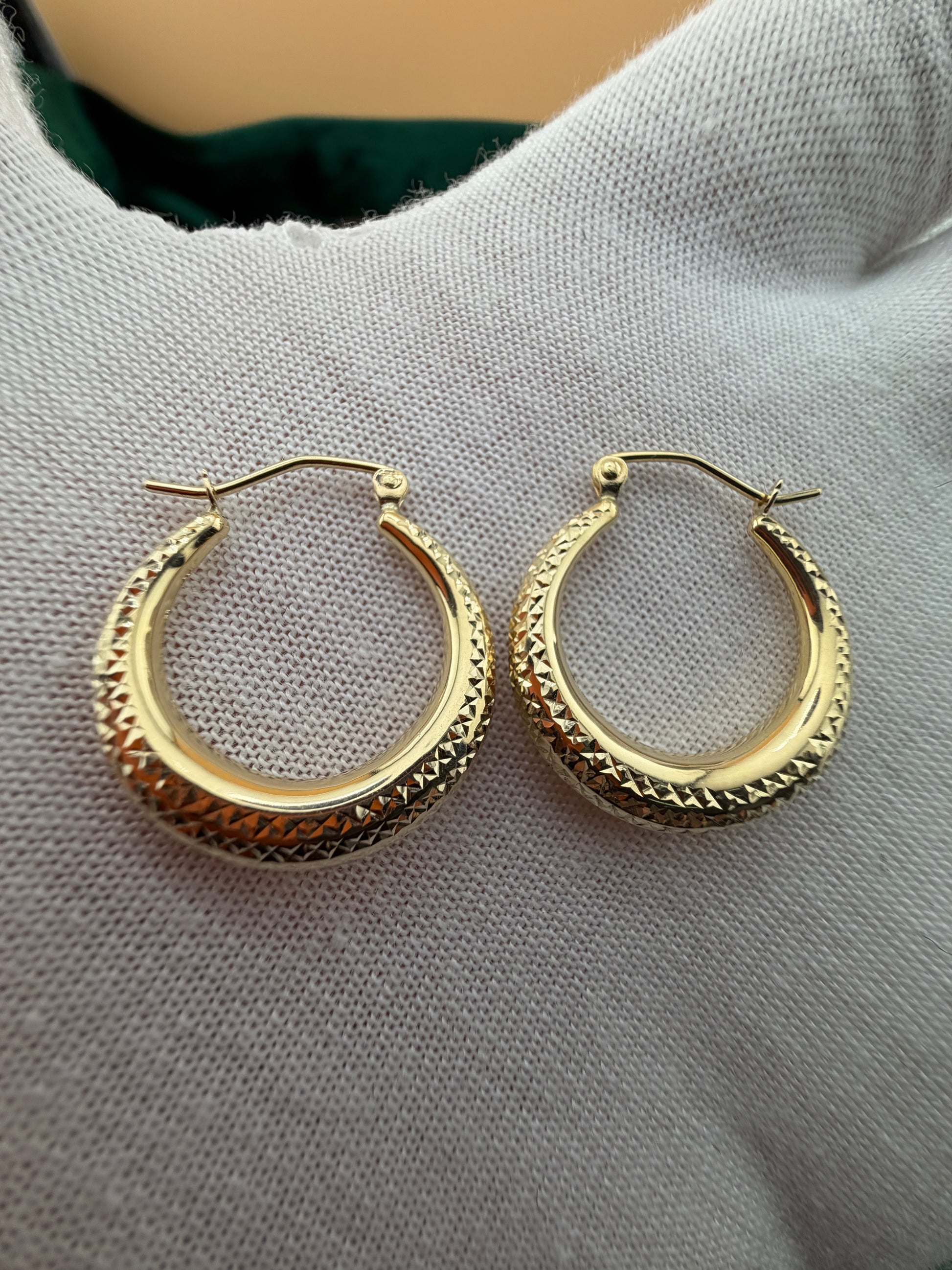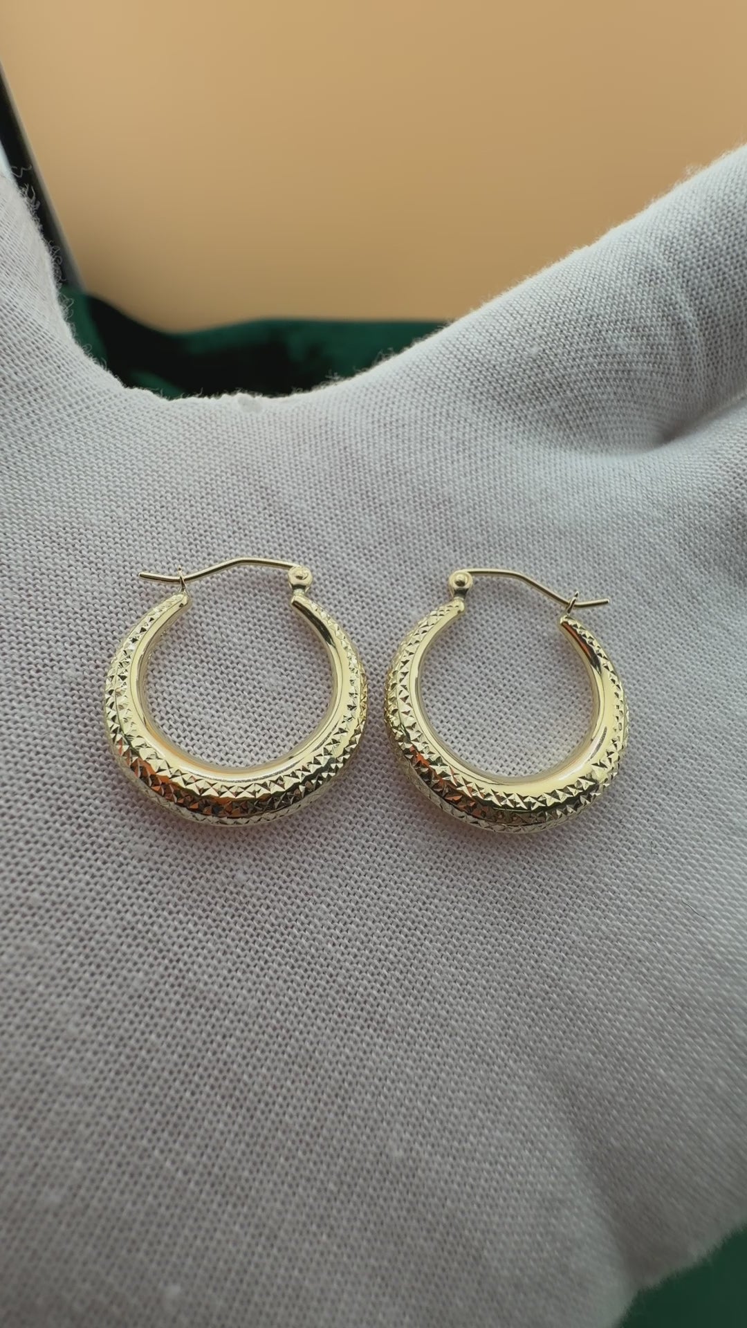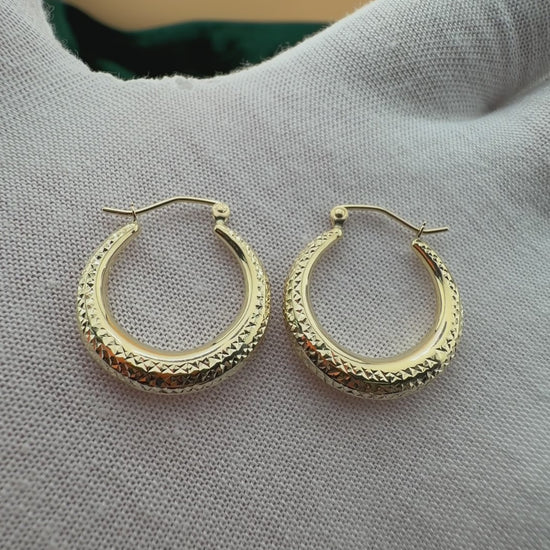 Classic meets bold in these 14K yellow gold hoop earrings, designed with a thick rounded profile and beautifully detailed diamond-cut texture along the edges. The high-polish center contrasts perfectly with the faceted pattern, giving these hoops a bright, eye-catching sparkle from every angle. The secure hinged wire clasp ensures comfortable, reliable wear all day long. Elegant, lightweight, and timeless—these hoops are a staple for any jewelry collection.