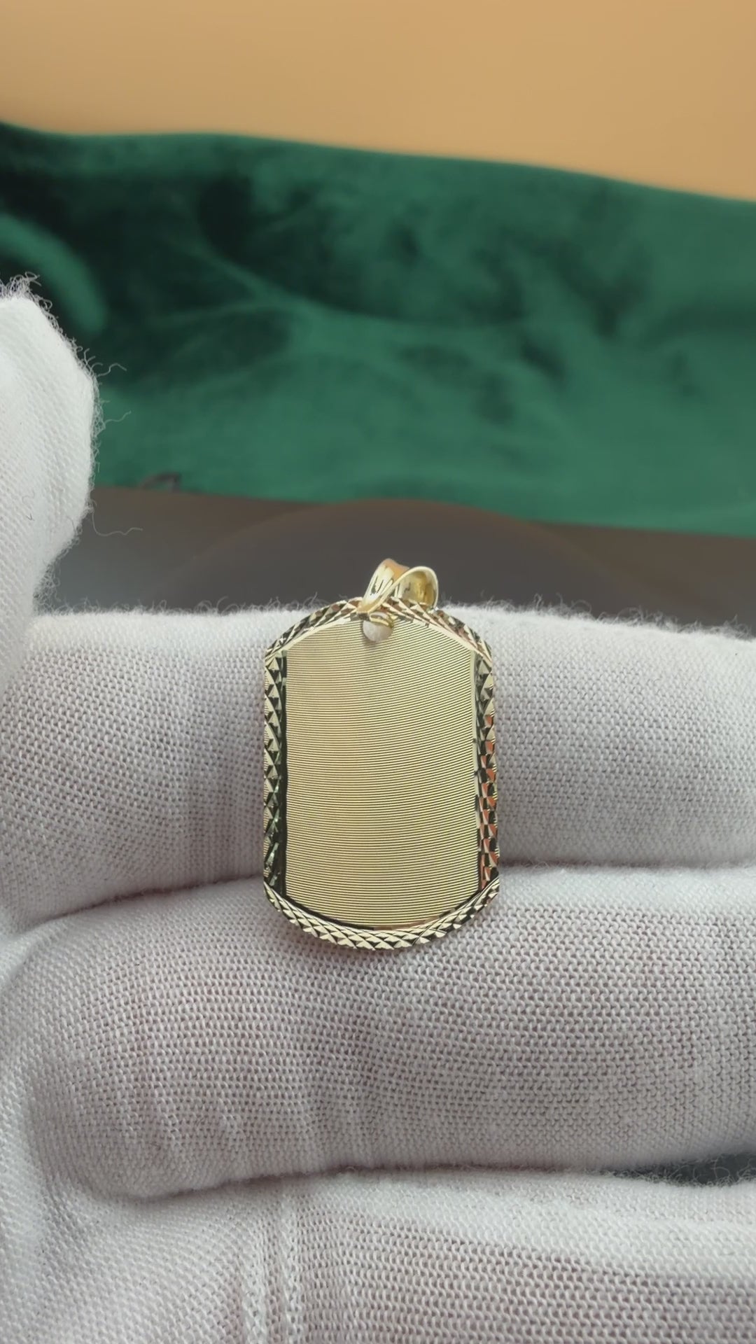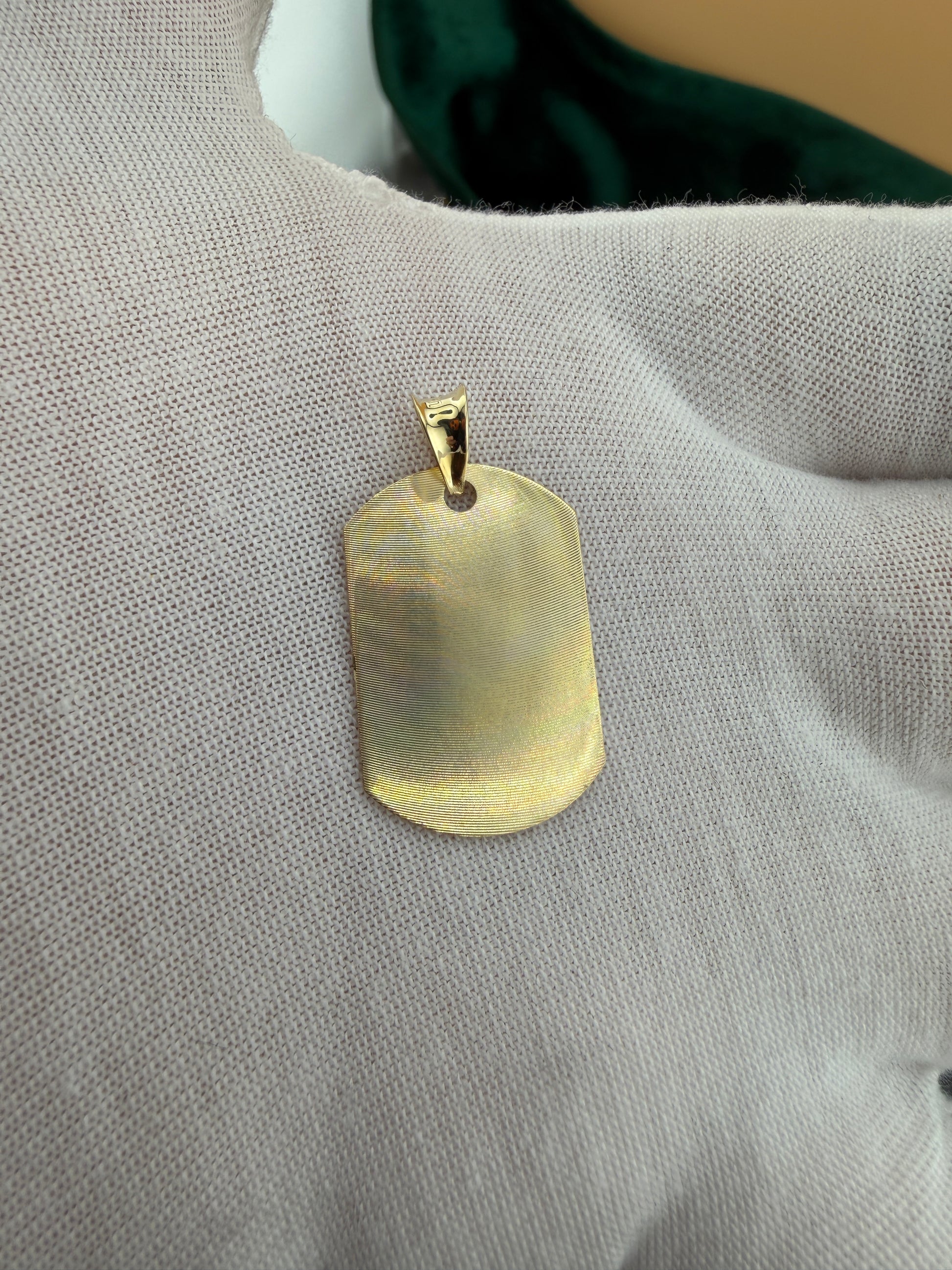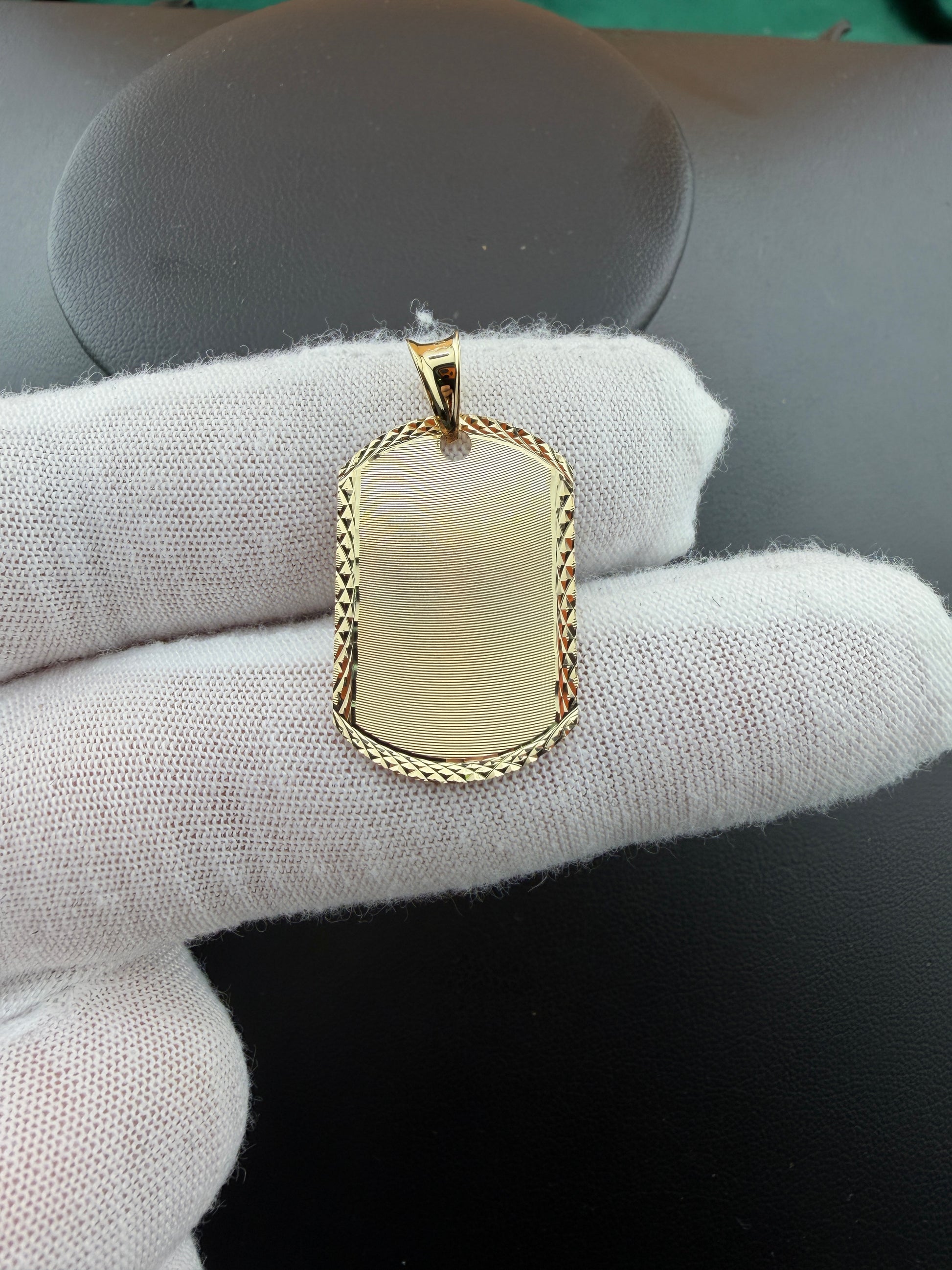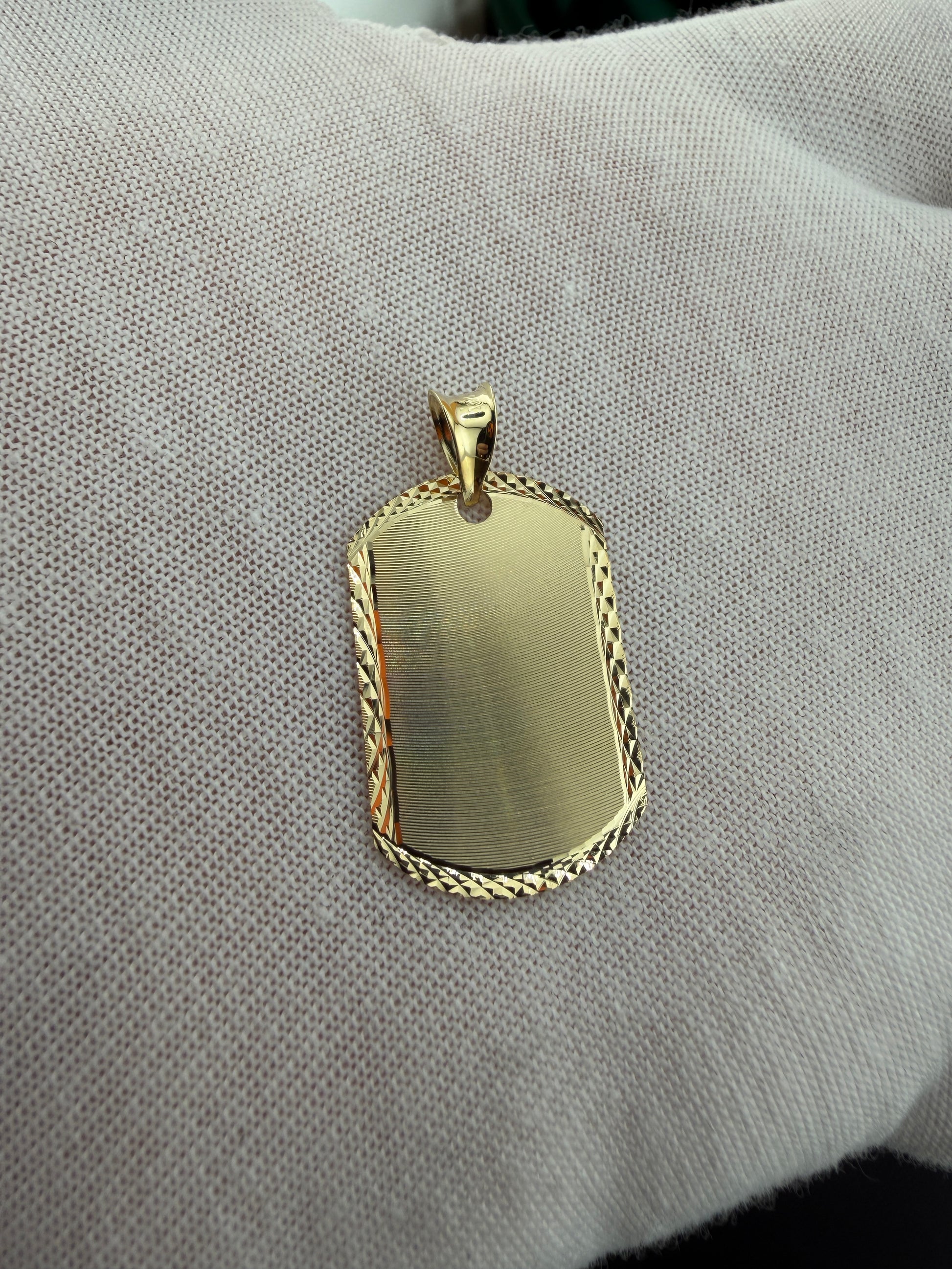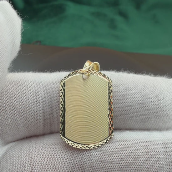 A classic 14K gold ID pendant featuring a sleek, engravable center framed by an intricate diamond-cut border. The smooth face offers a refined canvas for initials, names, or meaningful symbols, while the polished edges and textured perimeter add sophistication and visual depth. Finished with a bold, high-polish bail, this pendant brings a timeless, customizable touch to any chain—perfect as a personal keepsake or meaningful gift.