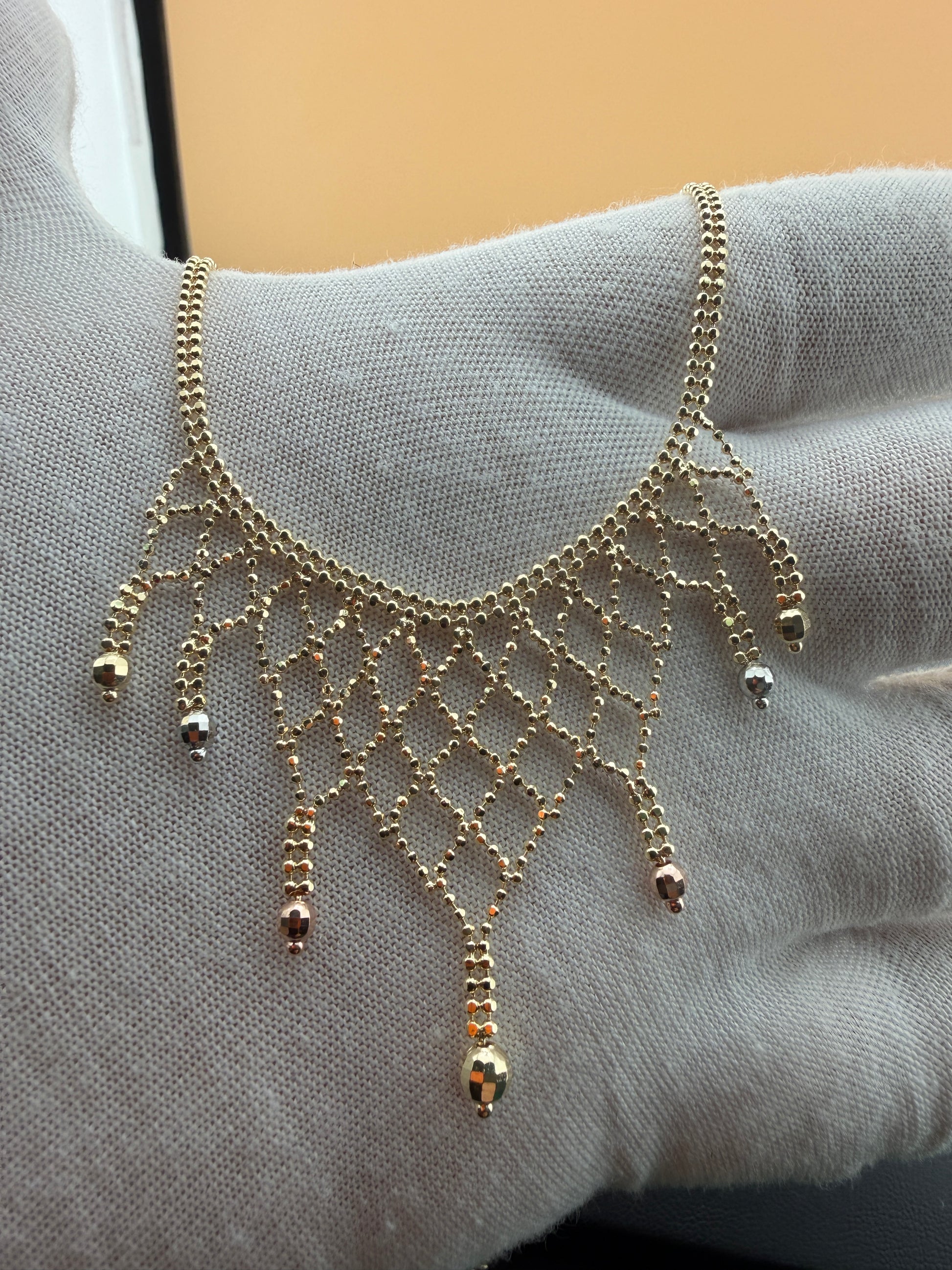 A breathtaking 14K tri-tone gold mesh necklace crafted with intricate latticework that drapes gracefully along the neckline. Each strand ends in a shimmering faceted bead—yellow, rose, and white-gold accents that add soft movement and a luxurious touch of color. The geometric mesh design creates a bold yet elegant silhouette, blending vintage charm with contemporary sophistication. Perfect for special occasions or elevated everyday wear, this necklace embodies artistry, fluidity, and refined craftsmanship in every shimmering detail.