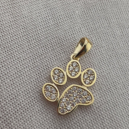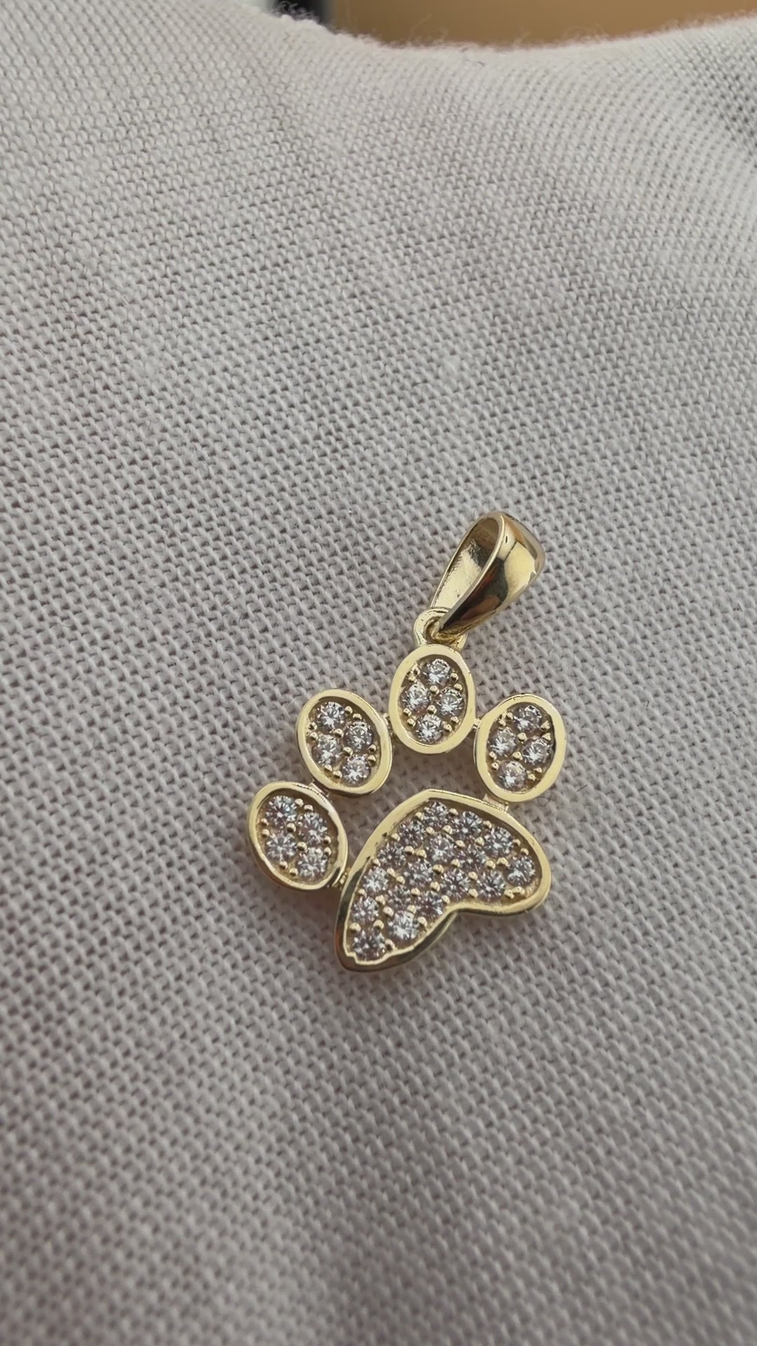 A charming and expressive 14K gold paw pendant, crafted for animal lovers who want to keep a symbol of loyalty and love close to heart. Each pad of the paw is pavé-set with brilliant cubic zirconia, creating a sparkling silhouette that catches the light from every angle. The smooth gold outlining elevates the design with warmth and refinement, blending playful sentiment with elegant craftsmanship. Whether as a tribute to a beloved pet or a statement of compassion, this piece shines with meaning and style.
