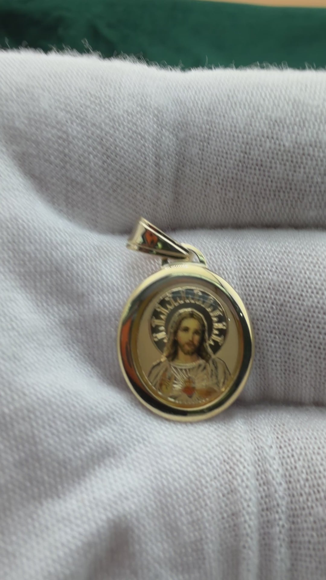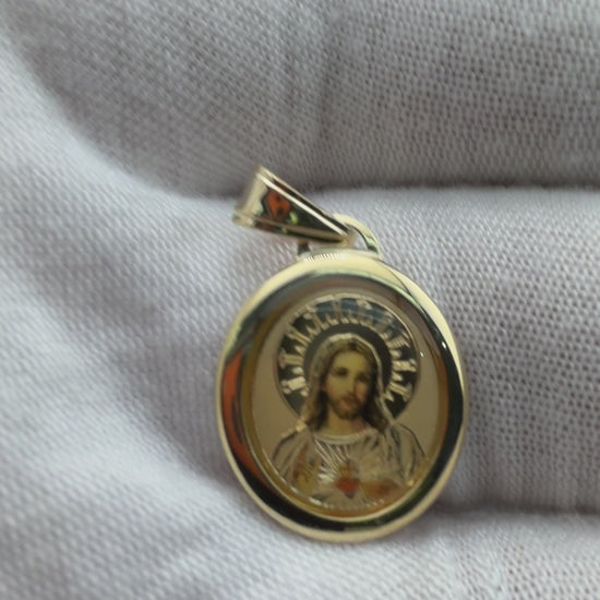 A radiant 14K gold Sacred Heart pendant featuring a finely engraved image framed by a smooth, polished border. The detailed depiction of Jesus is rendered with dimensional shading and a glowing halo motif, giving the piece spiritual warmth and depth. Its round silhouette and high-polish finish create a timeless, classic look, while the generous bail allows the pendant to pair beautifully with a variety of chains. Elegant, meaningful, and crafted with reverence, this pendant is a powerful expression of faith and devotion.