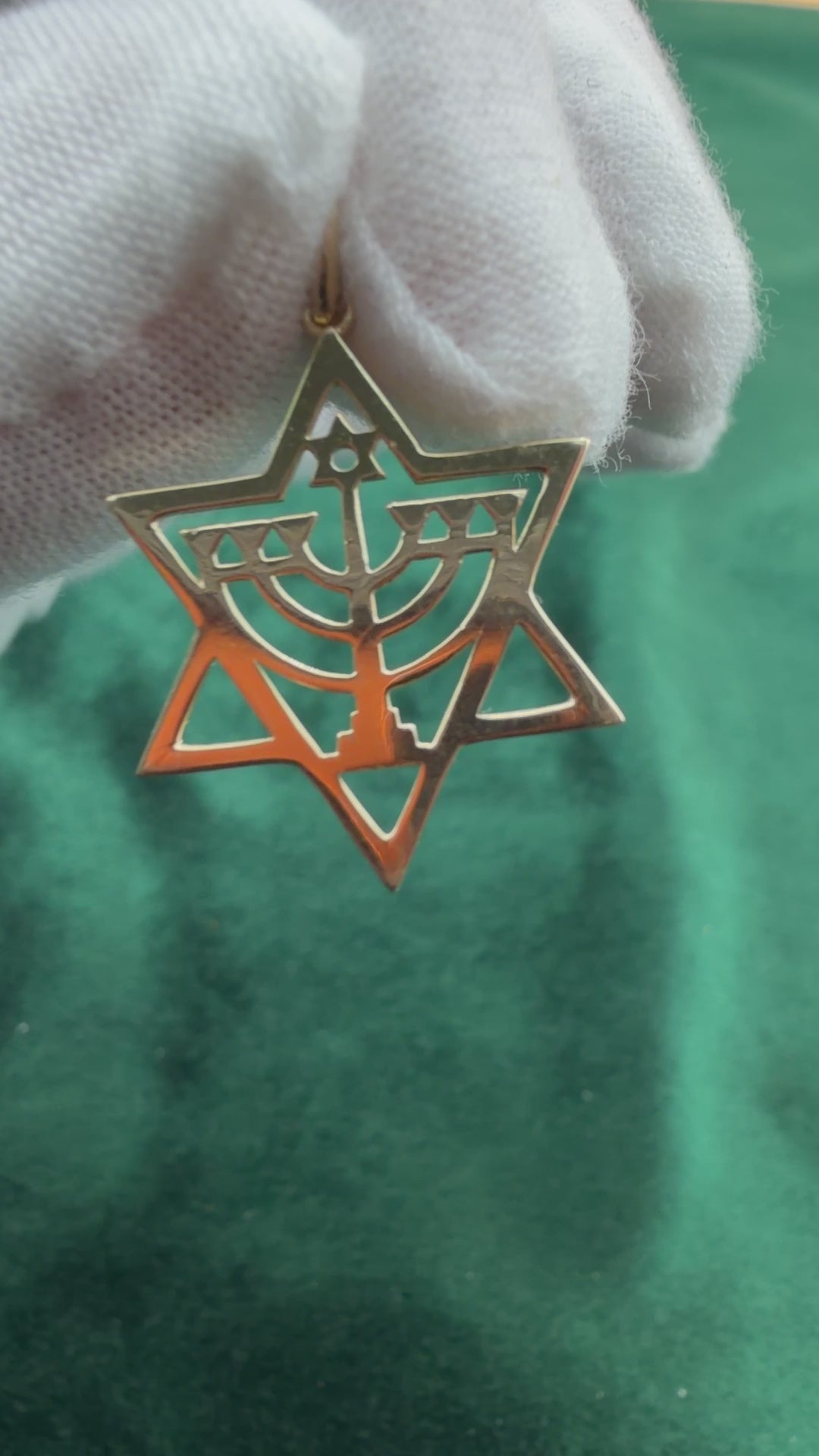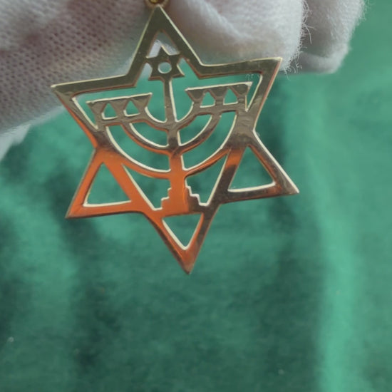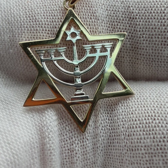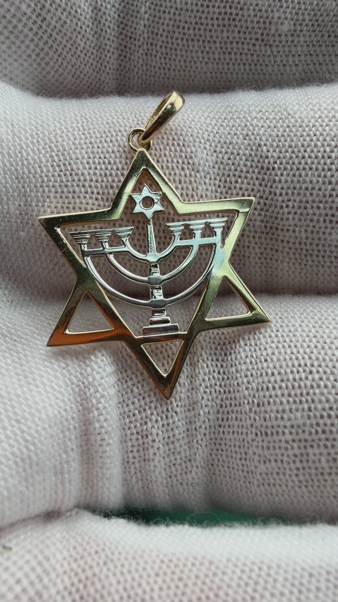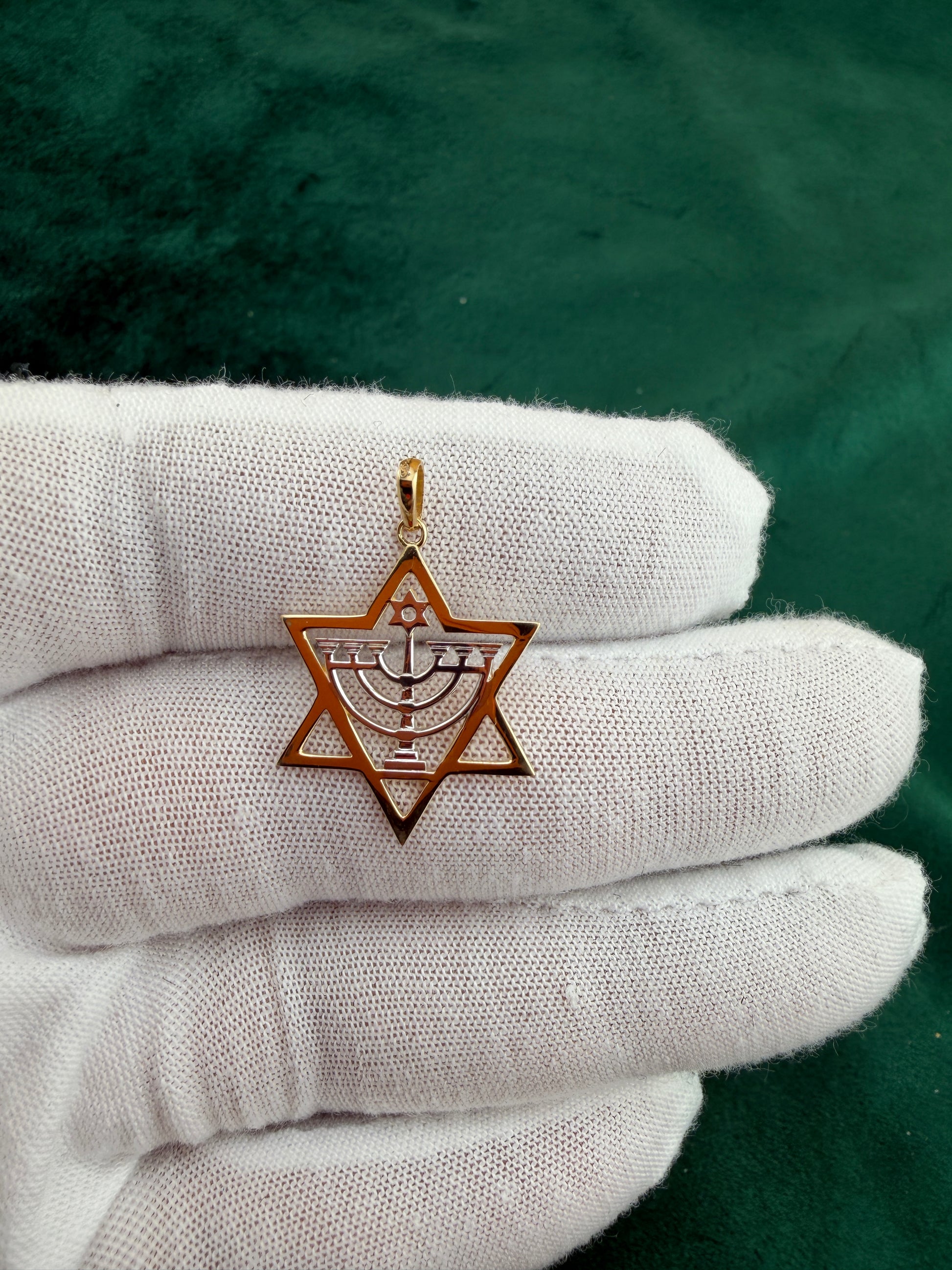 A meaningful 14K gold pendant that unites two powerful symbols—the Star of David and the menorah—into one refined openwork design. Crafted with smooth, precise lines and a high-polish finish, the pendant carries a striking clarity and depth while remaining lightweight and elegant. The central menorah adds a layer of spiritual richness, making this piece a bold yet respectful expression of heritage and faith. Timeless, symbolic, and polished to perfection, this pendant stands as a distinguished emblem of identity and tradition.