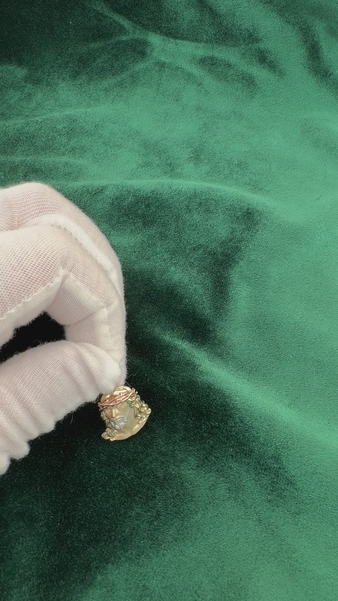A powerful 14K tri-color gold Jesus head pendant crafted with exceptional depth and artistry. The design features a warm yellow-gold foundation, a vivid rose-gold crown of thorns, and white-gold accents highlighting the beard and facial details—creating a lifelike, dimensional effect. Each curl of the hair and contour of the face is sculpted with precision, balancing matte textures with radiant high-polish surfaces. Bold, meaningful, and masterfully crafted, this pendant stands as a striking symbol of faith, devotion, and elevated craftsmanship.